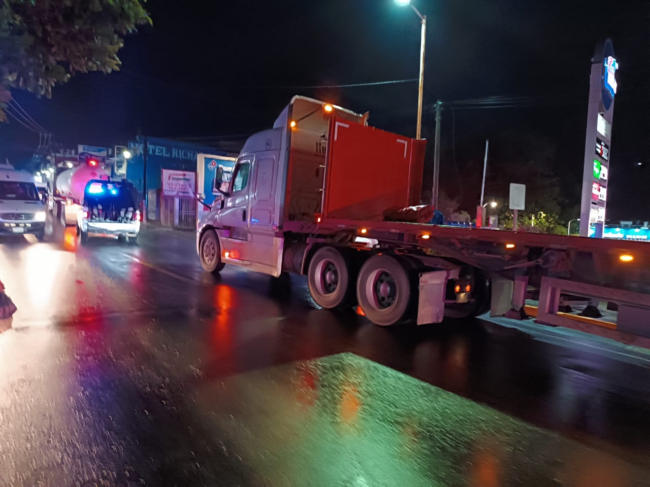 Los oficiales de dicha corporación pretendieron impedir la cobertura del suceso, sin embargo se logró saber que la patrulla marcada con la matrícula oficial, 18546 salía de dicha gasolinera y al intentar incorporarse a la carpeta asfáltica lo hizo por un costado del tráiler, posiblemente punto ciego para el chófer, lo que ocasionó le golpeara en su lado izquierdo, rompiendo el espejo y daños en la carroseria.