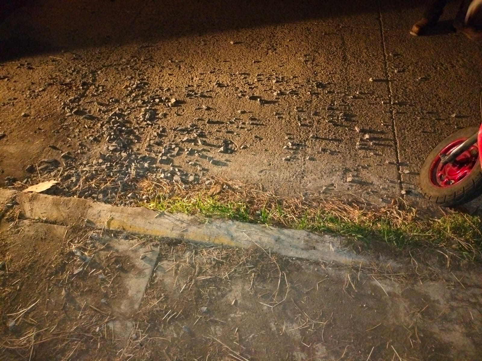 Debido a que durante la noche es más difícil notar este tipo de obstáculos en las vialidades, testigos oculares comentan que el conductor de una motocicleta en color amarillo con negro, de la marca Vento, perdió el control derrapando mientras descendía por la pendiente de la mencionada calle, al rededor de las 8:40 de la noche.