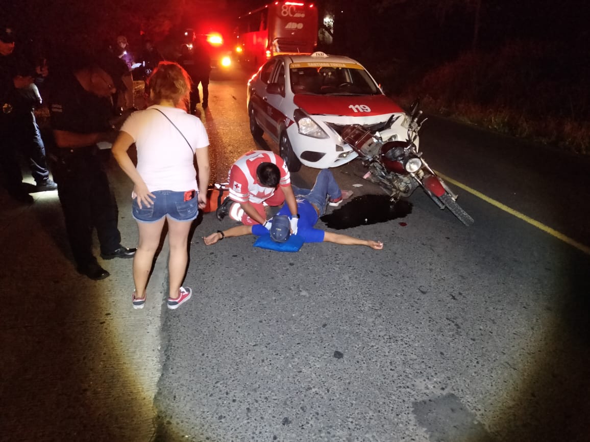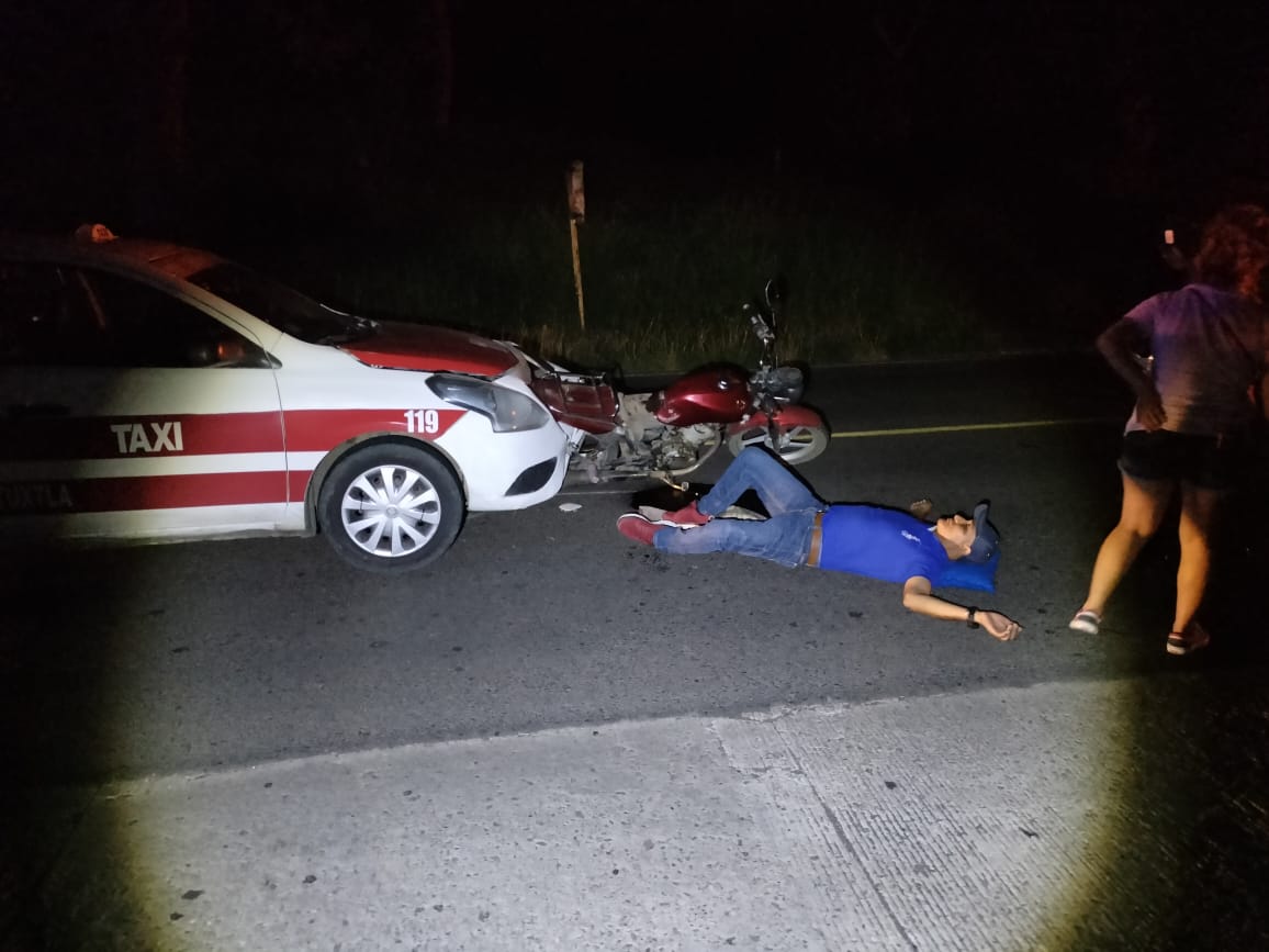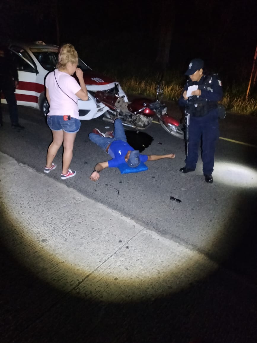 San Andrés Tuxtla, Veracruz. – La noche de ayer alrededor de las 20 horas, sobre la carretera federal 180 en el tramo San Andrés – Santiago Tuxtla, a la altura de la localidad de Los Pinos, muy cerca del C4, se registró un accidente vehicular participando un taxi y una motocicleta, dejando como resultado daños materiales y al motociclista lesionado.