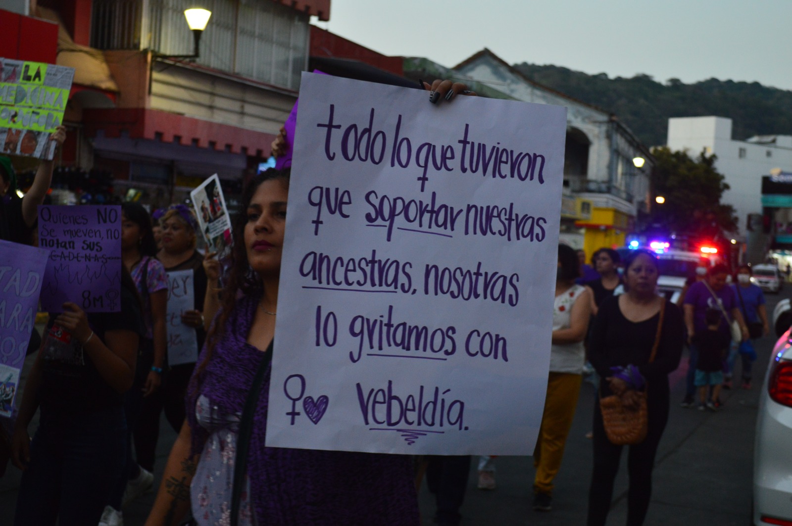 Escoltadas en la zona centro de la ciudad por autoridades de policía estatal, tránsito del estado, policía municipal y transporte público, las integrantes de la marea violeta gritaron consignas cómo: “justicia”, “vivas nos queremos”,”amiga hermana si te pega no te ama”, “@b0rt3mos el patriarcado” entre otras que llegan como respuesta a la violencia normalizada en México.