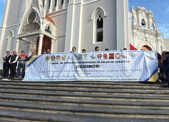 Trabajadores de salud en Veracruz protestaron en Xalapa para exigir información sobre transición al IMSS-Bienestar y certeza laboral. Trabajadores del…