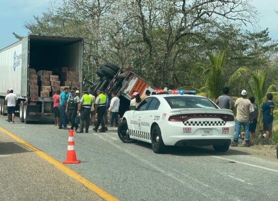 Camión se accidenta y pobladores de San Juan Evangelista ayudan a pasar mercancía a otro remolque