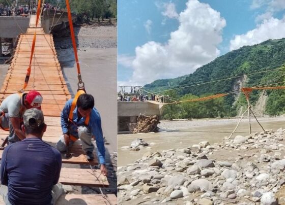 Pobladores de Texcatepec construyen puente colgante de madera tras quedar incomunicados