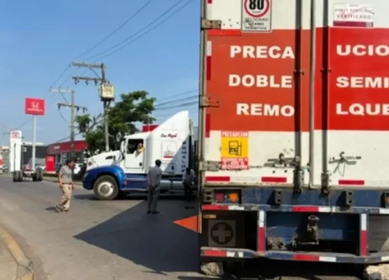Tráiler se atora en el distribuidor vial Bicentenario, en Veracruz