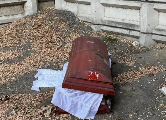 El ataúd que fue colocado sobre el distribuidor vial del Aeropuerto de Veracruz hacia avenida J.B. Lobos durante la mañana…