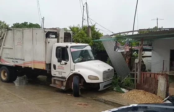 Camión de basura se queda sin frenos e impacta vivienda, en Oluta