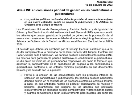 *Avala el Instituto Nacional Electoral (INE) que los partidos políticos deberán postular cinco mujeres y 4 hombres a las gubernaturas…