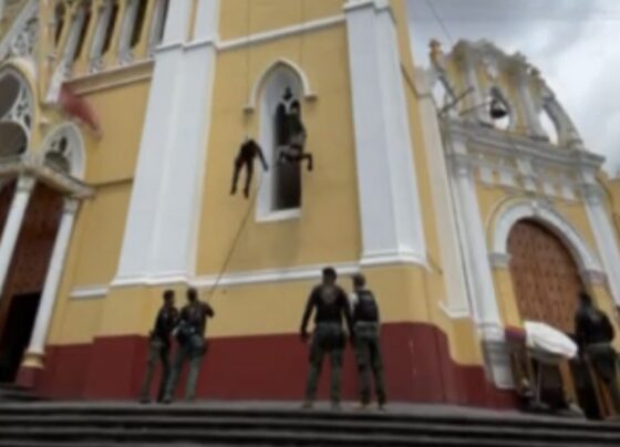 Dos elementos de la Fuerza Civil quedaron atorados en el aire con cuerdas enrolladas cuando descendían del campanario de la…