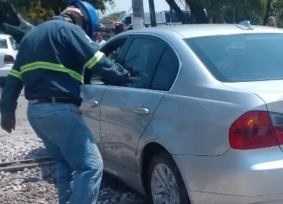 Carro se queda atorado sobre las vías del tren en carretera Veracruz-Xalapa