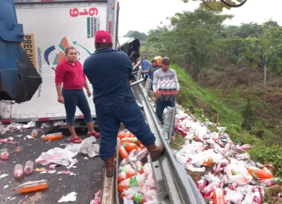 ¡Se llevaron todo! Rapiñan tráiler volcado con refrescos en Las Choapas