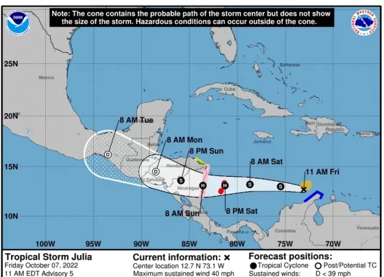 La tormenta tropical ‘Julia’ se convertiría en huracán este sábado 8 de octubre, impactaría Nicaragua el domingo y los remanentes…