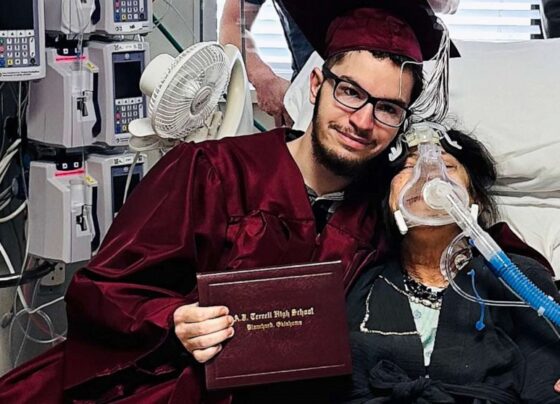 Caleb Woodrum tuvo que adelantar su graduación antes de que su mamá, quien tenía cardiopatía congestiva, murió en el hospital…
