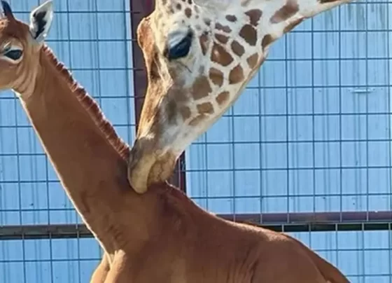 Una extraña jirafa de color marrón sin las manchas clásicas que caracterizan a la especie, nació en un zoológico del…