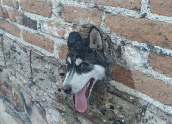 La cabeza de un perro quedó fuera de una barda luego de que ingresó al interior de una tubería La…