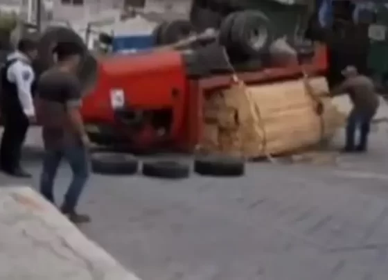 Una grúa de la Policía de Tránsito que intentó ayudar a una camioneta volcada en Chimalhuacán, Estado de México, se…