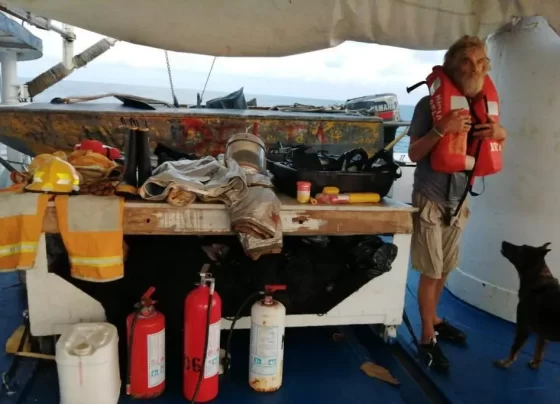 Timothy Lyndsay Shaddock, el náufrago australiano que fue rescatado el lunes por un buque de atún Tuny, y su perrita…
