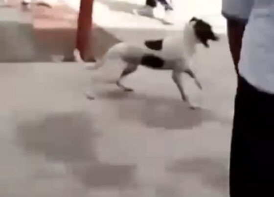 Se ve a las autoridades escolares jalar del cuello a uno de los caninos con una cuerda y otros siendo…