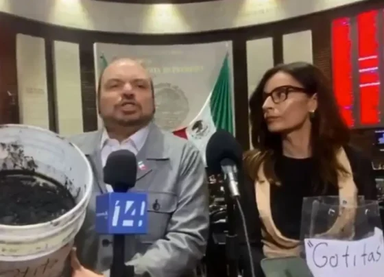 Los diputados de Movimiento Ciudadano, Sergio Gil y Laura Ballesteros, llevaron una cubeta con chapopote recogido de las playas de…