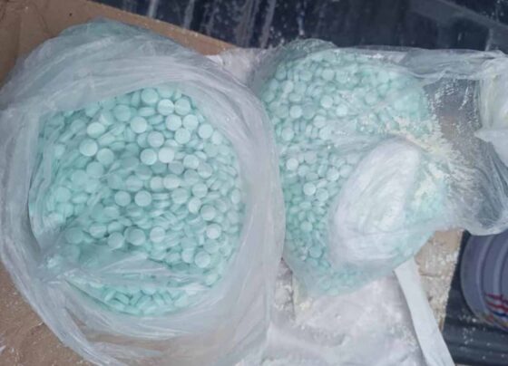 Las pastillas de fentanilo fueron localizadas ocultas en el interior de un recipiente de suplemento alimenticio en polvo Una dotación…