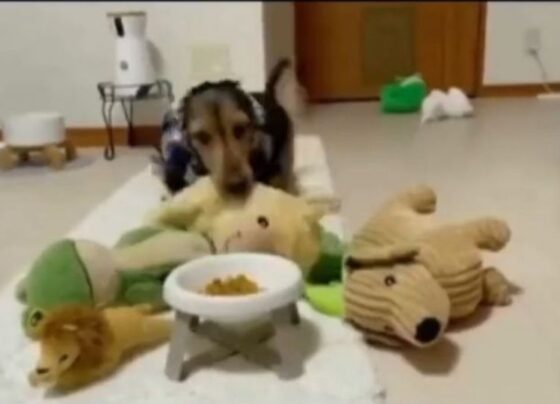 Perrito “derrite” de amor las redes por compartir su comida con sus amigos peluches