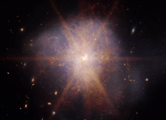 La colisión de las dos galaxias espirales comenzó hace unos 700 millones de años y provocó un enorme estallido de…