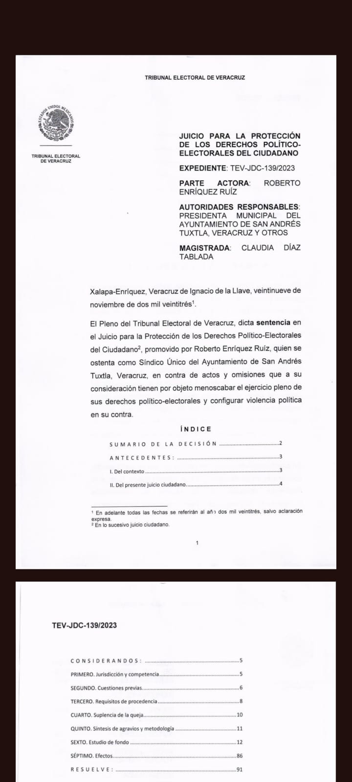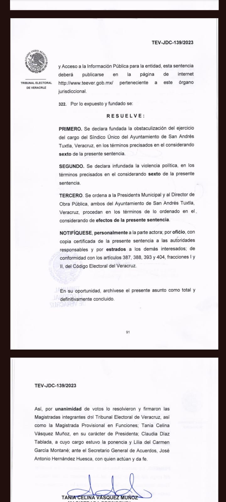 Con esto, el TEV señaló que se confirmó la obstaculización del ejercicio del cargo del médico Roberto Enríquez Ruiz como representante legal del ayuntamiento y quedando nula la intención de la alcaldesa por obtener esta comisión.