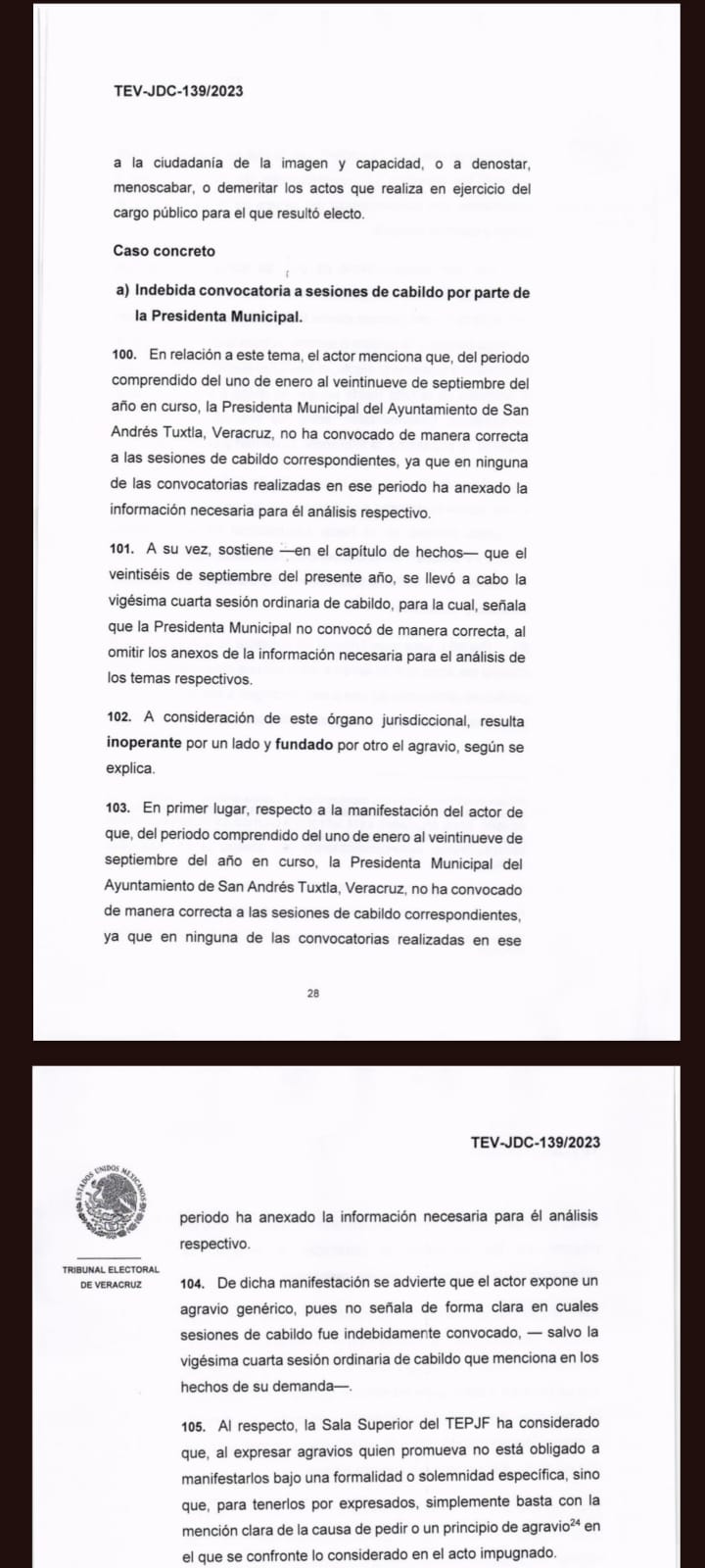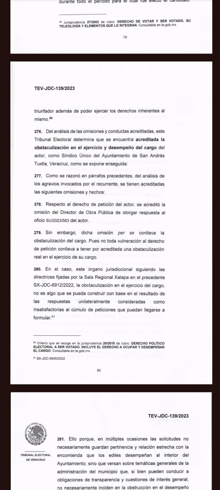 Frente a decenas de personas El pleno del tribunal electoral de Veracruz dictó sentencia el pasado 29 de noviembre de este año, al declararse fundada la obstaculización del ejercicio del cargo del actor ya que se le negó el derecho de participar con voz y voto en algunas sesiones de cabildos, y dónde se le intentó quitar la representación legal del ayuntamiento.