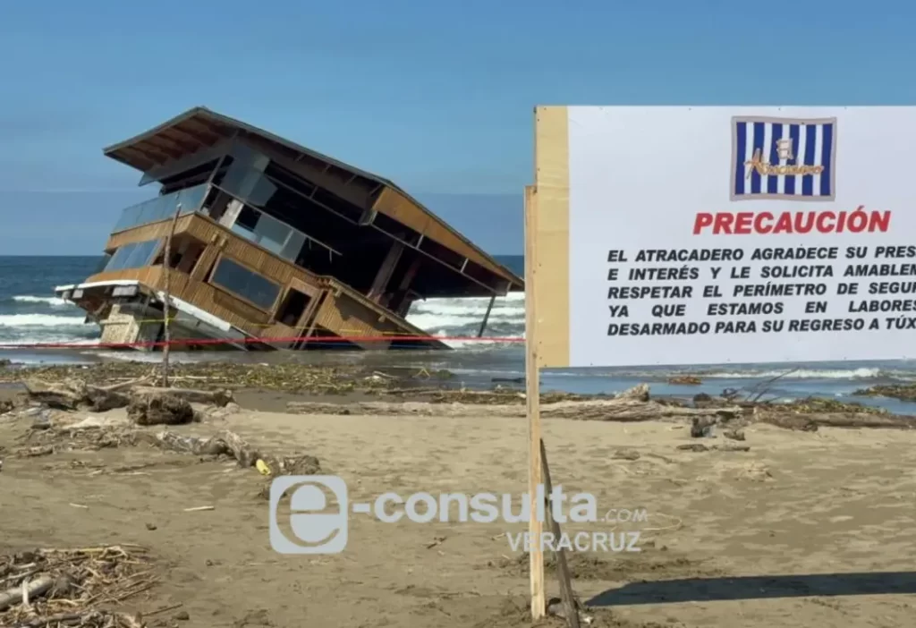 Los restos del restaurante El Atracadero, originario del puerto de Tuxpan, recorrieron más de 300 kilómetros hasta Coatzacoalcos, arrastrado por las corrientes del Golfo de México tras las inundaciones registradas en el norte del estado.