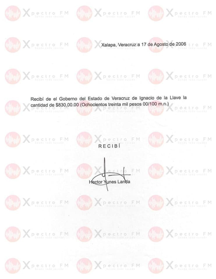 También, en otros recibos, aparece la firma autógrafa del candidato plurinominal a la diputación local, Héctor Yunes Landa, quien, de igual forma, recibía cantidades millonarias por parte del gobierno del estado para financiar personal y estructuras operativas en diferentes puntos de la entidad.
