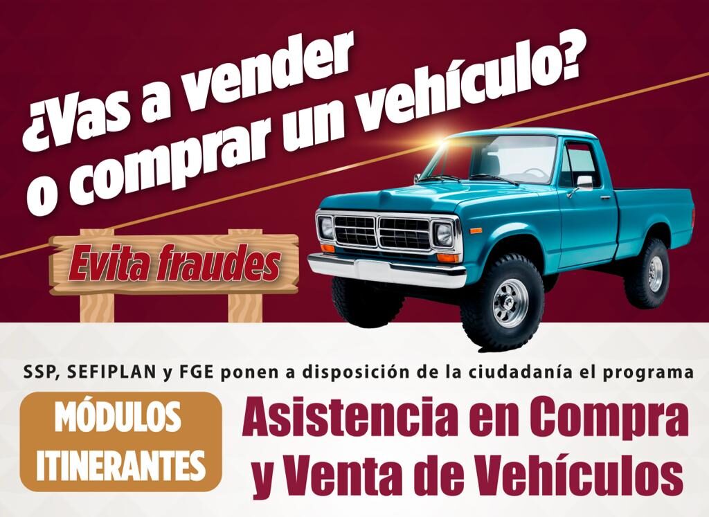 Con el propósito de fortalecer la seguridad patrimonial de la ciudadanía y prevenir el robo y/o fraude en la compra-venta de vehículos, el Gobierno del Estado, a través de las Secretarías de Seguridad Pública y Finanzas y Planeación, en coordinación con la Fiscalía General del Estado, implementará un programa que consta de módulos itinerantes de asesoría y verificación vehicular.