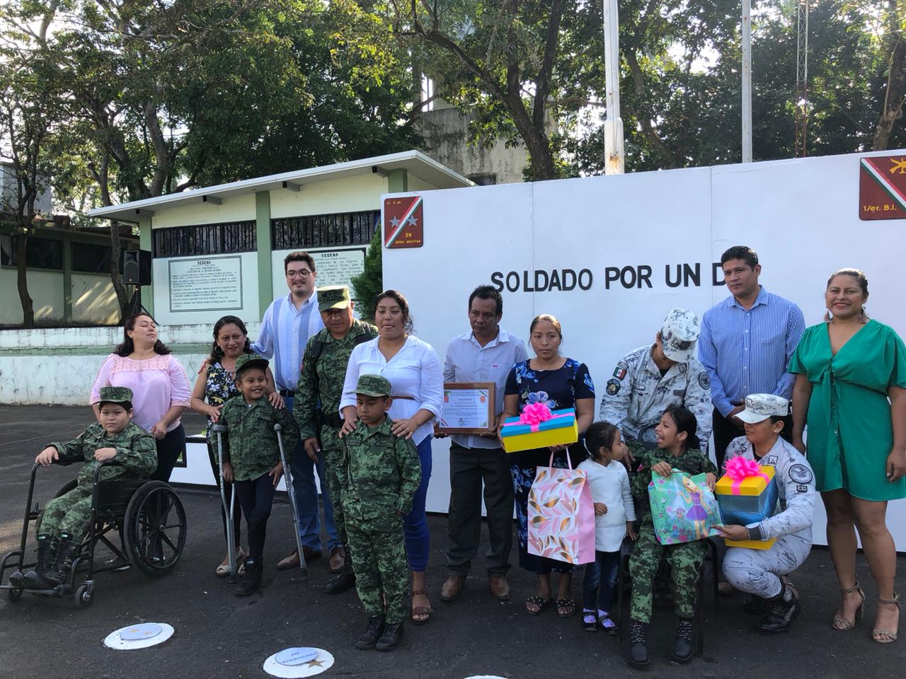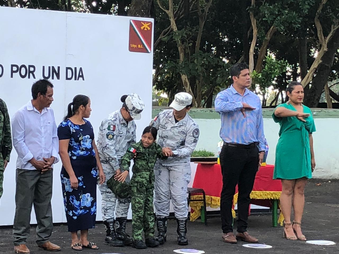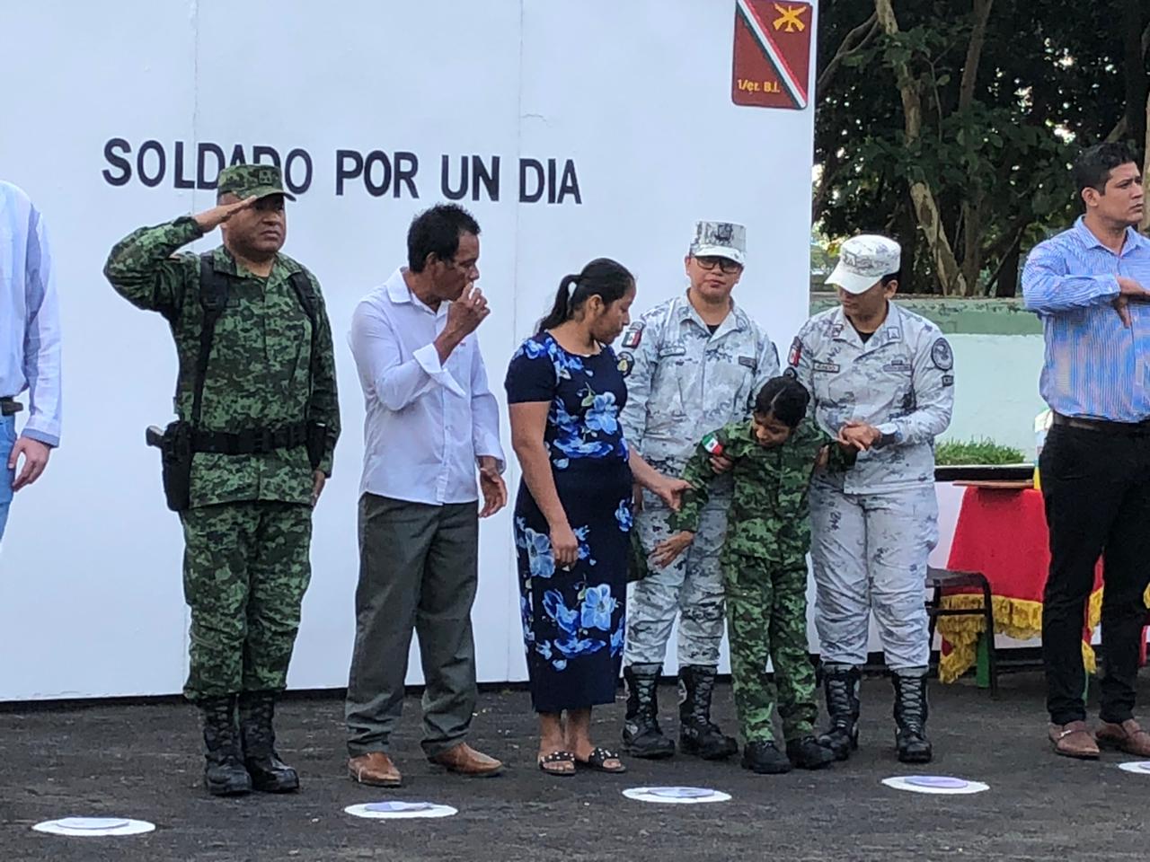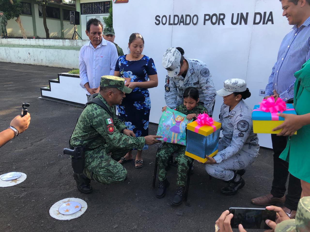 Hoy, la pequeña Itayetzi Zapot Carvajal de ocho años, cumplió su sueño de ser soldado honorario por un día en la base militar del primer batallón de infantería de San Andrés Tuxtla.