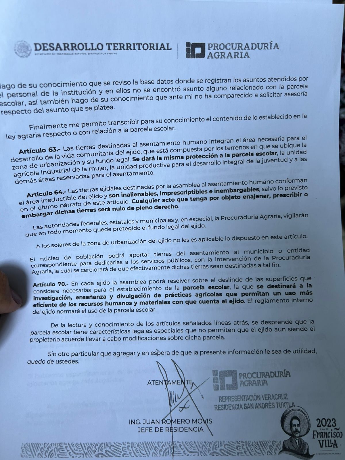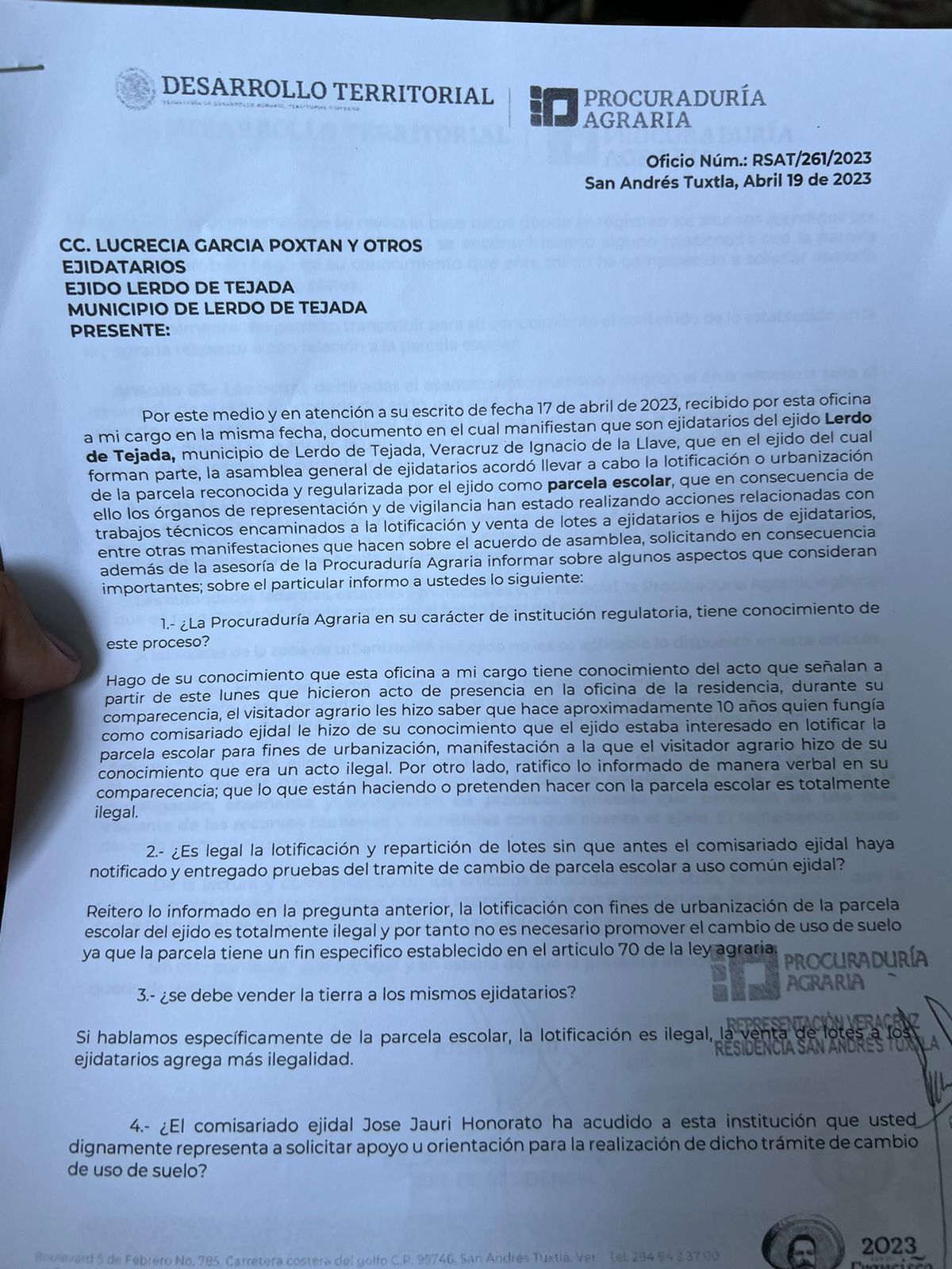 Lerdo de Tejada, Ver.- Ejidatarios de Lerdo de Tejada mostraron esta mañana el oficio numero RSAT/ 261/2023 donde la Procuraduría Agraria asegura que la venta de lotes del Ejido Lerdo de Tejada es ilegal.
