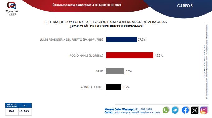 De acuerdo a Massive Caller, en el análisis por candidatos, si hoy fueran las elecciones, en un primer escenario hipotético en que se enfrentaran Rocío Nahle y Miguel Ángel Yunes Márquez, la morenista se impondría fácilmente con 42.5 por ciento de la intención del voto contra 28.4 por ciento.
