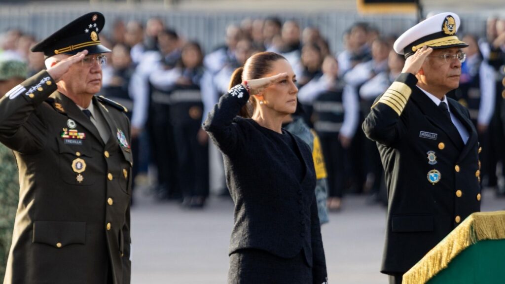 El secretario de Seguridad y Protección Ciudadana, Omar García Harfuch, y la Coordinadora Nacional de Protección Civil, Laura Velázquez; la jefa de Gobierno de la Ciudad de México, Clara Brugada. Posteriormente, entonaron el himno nacional y regresar a Palacio Nacional para una nueva conferencia matutina.