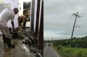En tanto que en Cosolecaque, los anuncios de una gasolinera también salieron volando por las fuertes ráfagas de viento, además de los productos que tienen en exhibición.